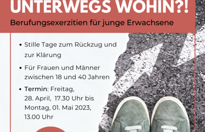 Kurzexerzitien Unterwegs wohin?! Berufungsexerzitien für junge Erwachsene Möglichkeit zum Rückzug und zur Klärung für Frauen und Männer zwischen 18 und 40 Jahren. Termin: Freitag, 28. April, 17.30 bis Montag, 01. Mai 2023, 13.00 mehr: Unterwegs wohin?!