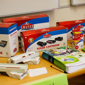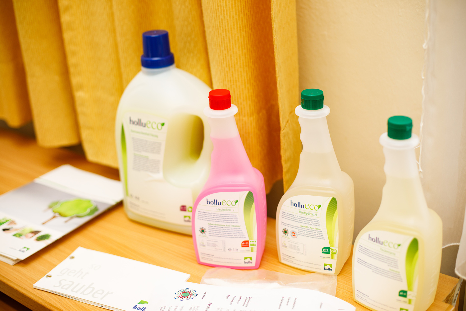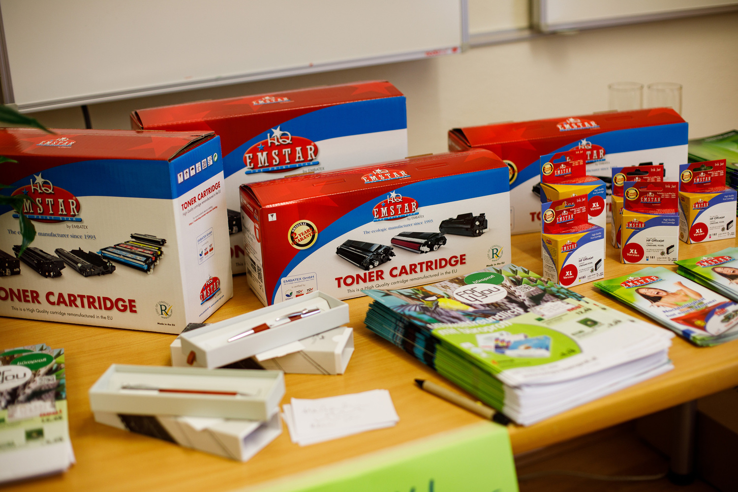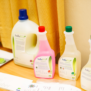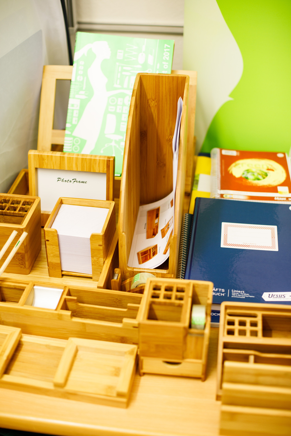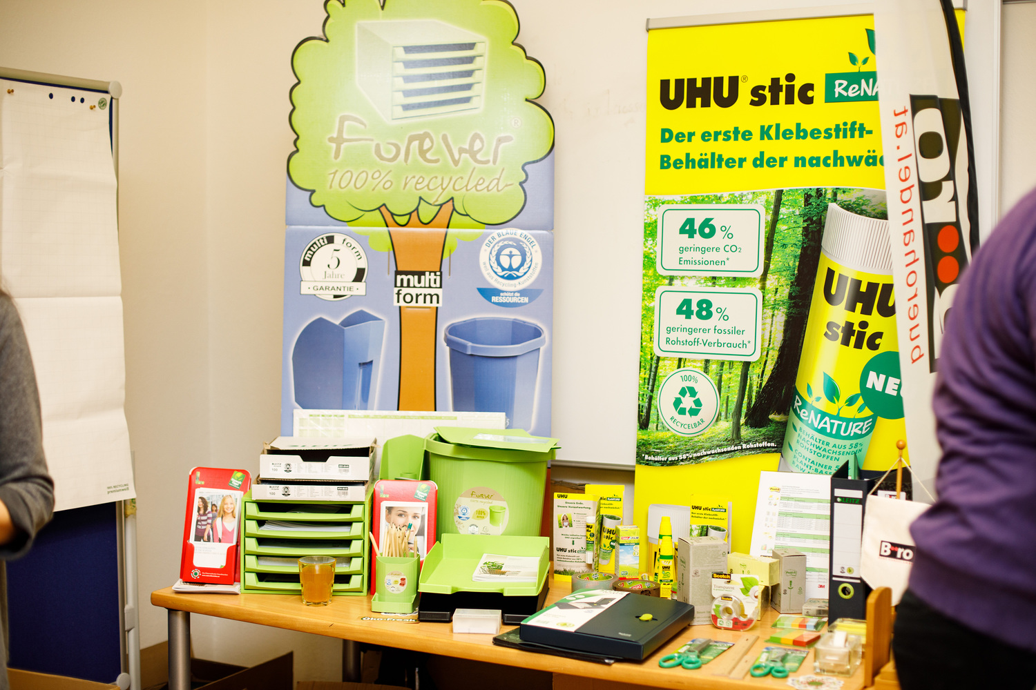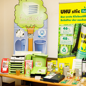Zerlegbare Mappen, Recycling-Hefte, lösungsmittelfreie Klebstoffe, Ablagen aus Bambus, Kugelschreiber aus PET-Flaschen und Post-its aus Altpapier wurden vorgestellt. Dazu gab es noch nachfüllbare Toner und Druckerpatronen, Grünpflanzen zur Verbesserung des Raumklimas, Fairtrade-Produkte, Taschen und T-Shirts aus Bio-Baumwolle, Blöcke aus Altpapier und Infos zu nachhaltigem Druck und Reinigung.