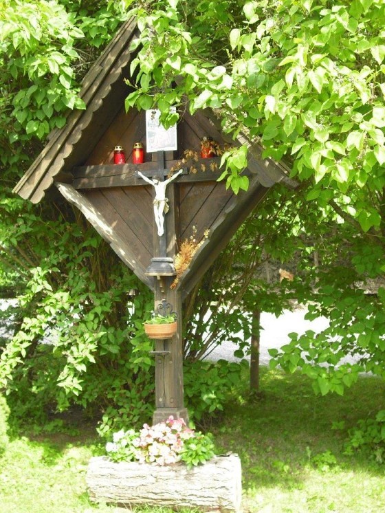 Dieses wunderbare Holzkreuz mit der Christusfigur steht zwischen dem Wohnhaus von Johann Fuchsbichler vlg. Hansbauer und Stall im Hofbereich, umgeben von schönen Flieder-, Jasmin- und Wacholdersträuchen.