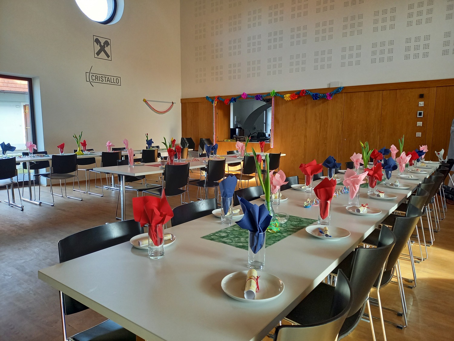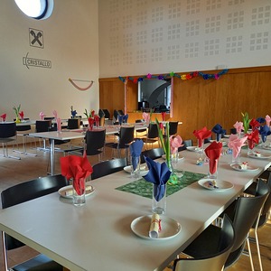 Die fleißigen Hände vom Pfarrgemeinderat und unserem Team des Begegnungsnachmittags haben den Saal wunderbar geschmückt und einige haben Krapfen und Strauben für die Besucher gebacken.