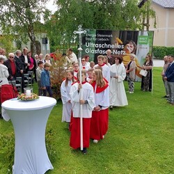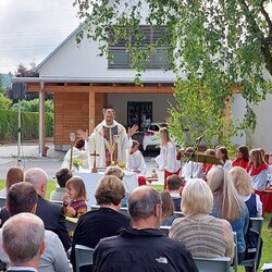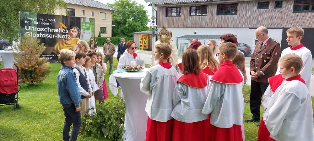 Gemeinsam mit der Pfarre Tobelbad feierten wir das Fronleichnamsfest beim Dorfkreuz in Lieboch. Der auferstandene Herr Jesus, der in der Gestalt des Brotes gegenwärtig ist, steht im Mittelpunkt.