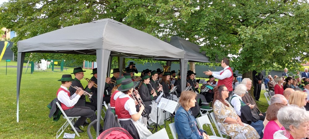Im Anschluss an die Hl. Messe, zelebriert von Vikar Gerhard Hatzmann und begleitet von Kantorin, Lektoren und liturgischen Diensten beider Pfarren, fand eine Andacht bei den vier Stationen am Dorfplatz statt. Für die kleine Prozession waren vier Brottische als Altäre gerichtet, als Sinnbild für die vier Himmelsrichtungen und dafür, dass Christus der Heiland der ganzen Welt ist. Im gemeinsamen Liedruf "Brot des Lebens" zogen die liturgischen Dienste und die Kinder stellvertretend für das Volk Gottes zu den vier Altären: Brot der Liebe – Brot der Versöhnung – Brot des Friedens – Brot der Hoffnung. Zum Abschluss erteilte Vikar Hatzmann den Eucharistischen Segen, verbunden mit der Einladung, das Allerheiligste gemeinsam zur Kirche zu begleiten. Die Feier schloss mit dem gemeinsam gesungenen "Te Deum" ab. Zu den Feierlichkeiten waren auch die Vereine wie Feuerwehr und ÖKB eingeladen.