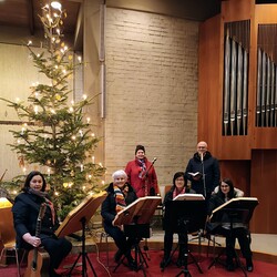 Weihnachtsmelodien der Bläsergruppe stimmten auf die Feier der Geburt Jesu in der Kirche ein. Vikar Gerhard Hatzmann erleuchtete mit seinen Worten und mit seinem persönlichen „Engel“ die Heilige Nacht. Der Kirchenchor und die Streicher beseelten die Feier mit feierlichen Klängen.