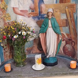 Das Bild unserer Schutzmantelmadonna mit den Bitten hängt in der Kirche bei der Marienstatue und lädt zum Entzünden einer Kerze ein.